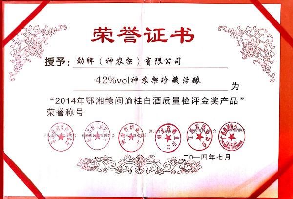 2014年7月,勁牌(神農架)有限公司“42%vol神農架珍藏活釀”榮獲2014年鄂湘贛閩渝桂白酒質量檢評金獎產品“。