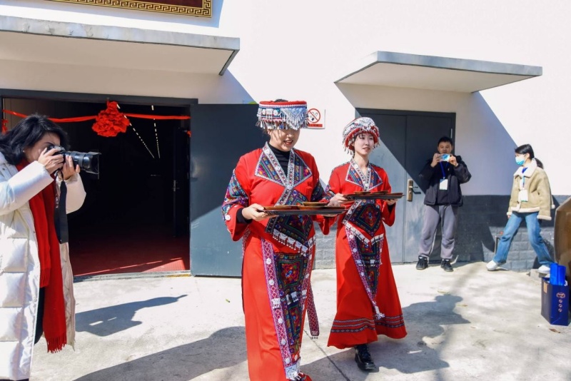 正式參觀前特別設置了攔門酒環節,穿著民族服飾的廠區工作人員在樓前喊著歌、遞著酒,引得嘉賓們一陣叫好,掌聲不斷。